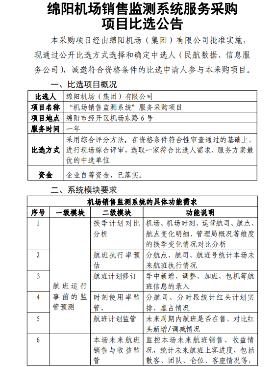 綿陽機場銷售監(jiān)測系統(tǒng)服務(wù)采購項目比選公告