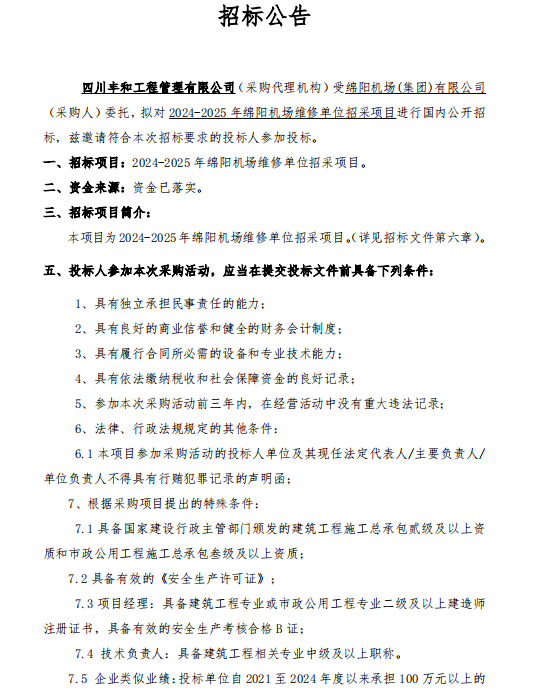 2024-2025年綿陽機場維修單位招采項目招標公告