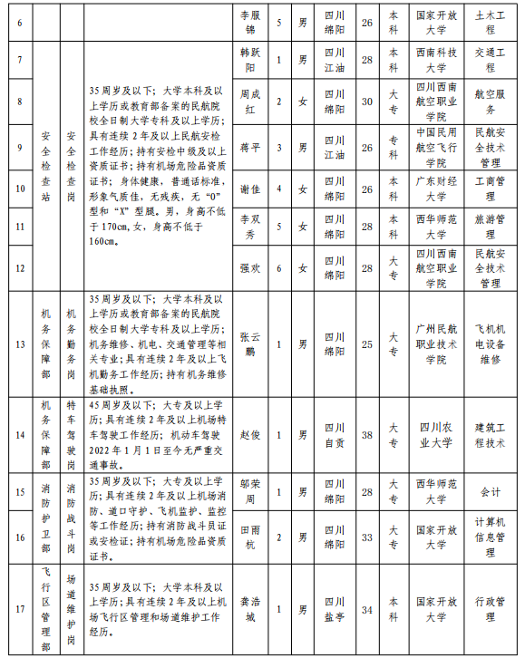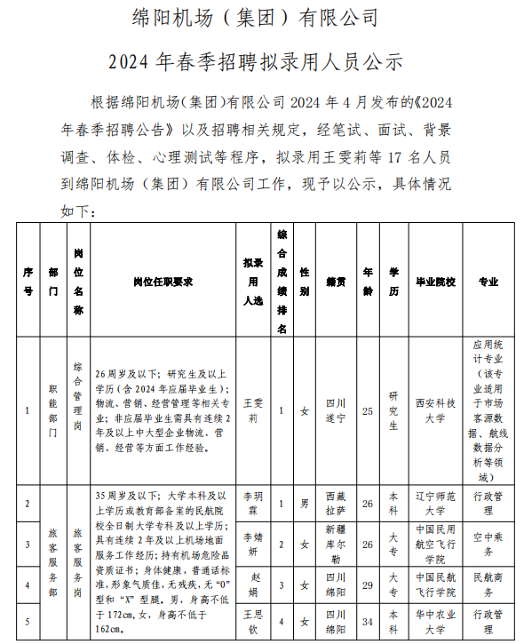綿陽機(jī)場(chǎng)(集團(tuán))有限公司 2024年春季招聘擬錄用人員公示